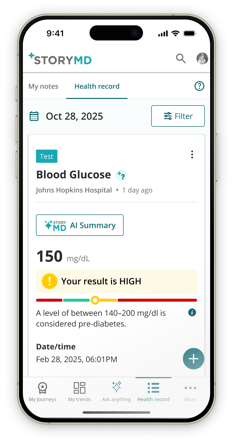 StoryMD’s health record is a comprehensive collection of all your health data. The record contains color-coded test results with easy to understand summaries, medical conditions, medications, and procedures, all contextualized via the library. Adding personal notes, images, and videos allows you to transform your health record into a personal diary of your overall health journey.